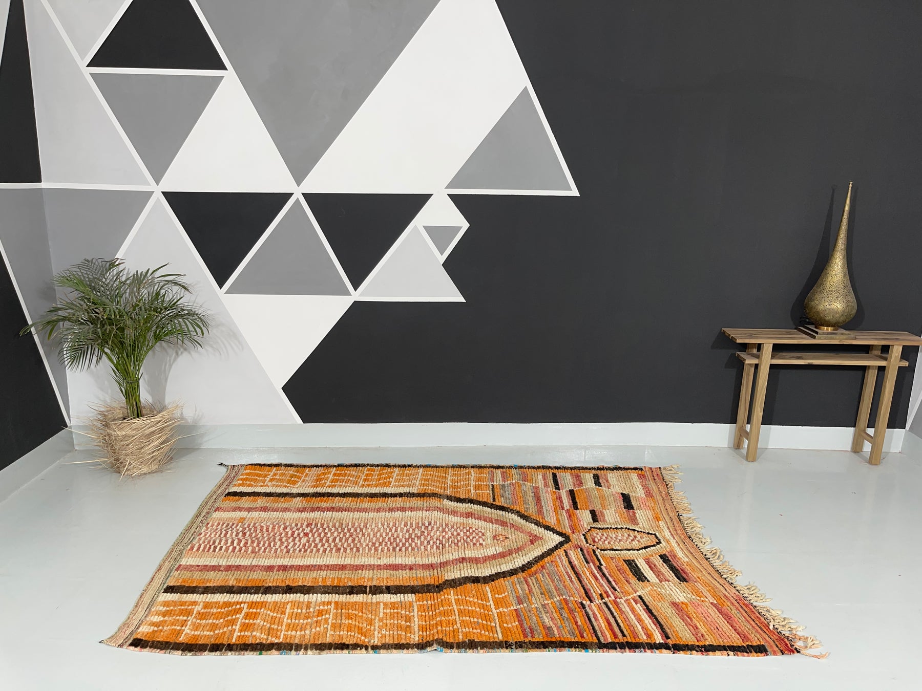 Our Boujaad Rug is a true statement of elegance and style. With its intricate geometric patterns and warm earthy tones, it adds a touch of sophistication to any space. Crafted from high-quality wool, this rug offers both durability and a luxuriously soft texture underfoot.